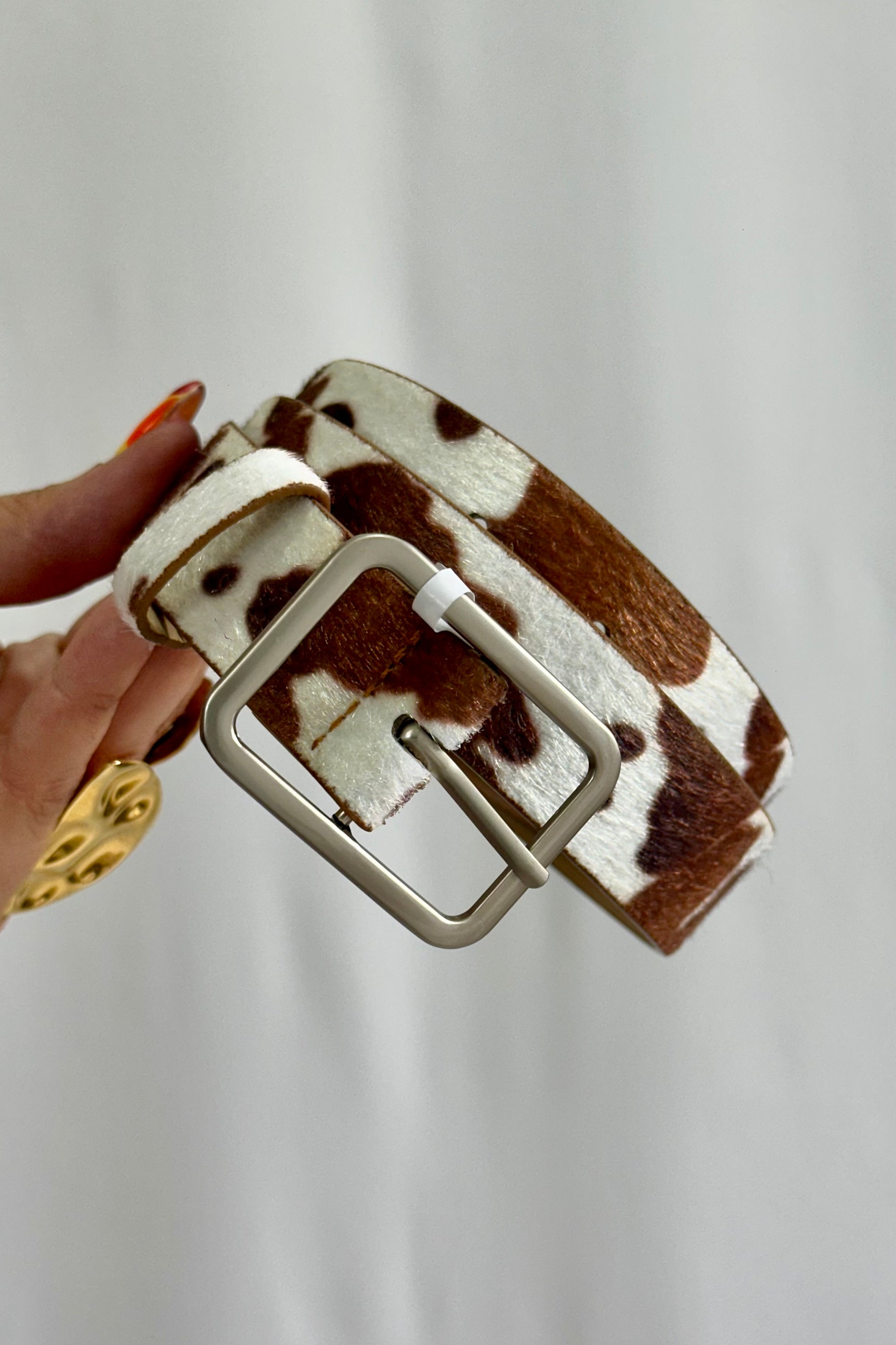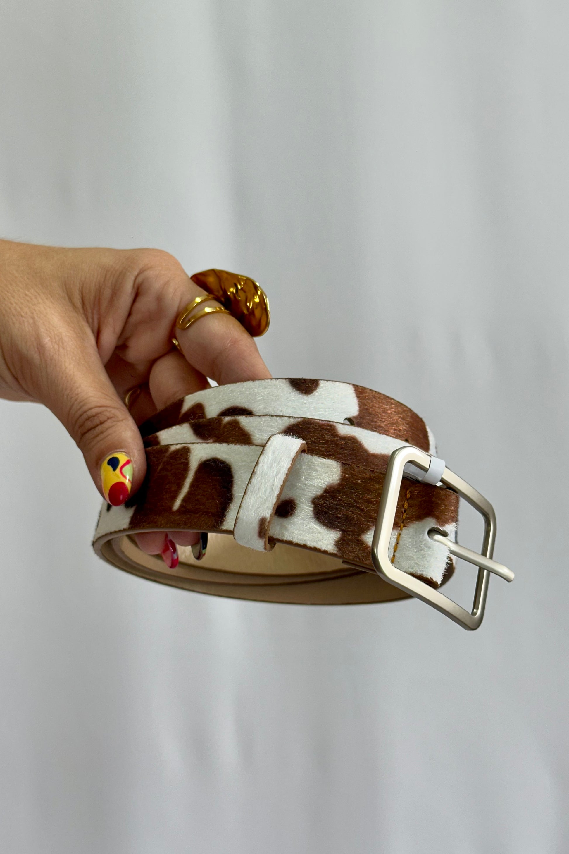 ¡Agrega un toque divertido y único a tu estilo con nuestro cinturón estampado de vaca!