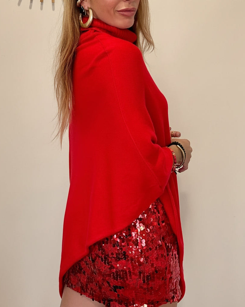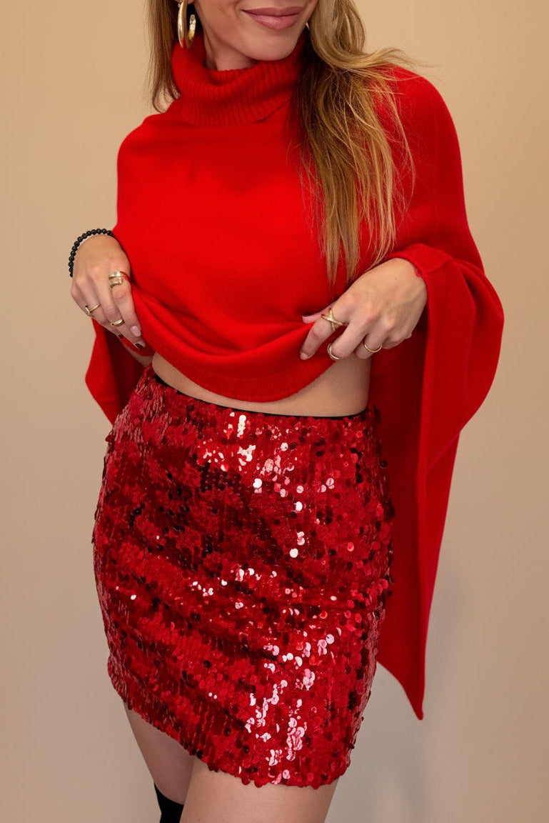 Esta falda corta en rojo fuego está cubierta de lentejuelas que reflejan la luz y capturan la atención de todos.