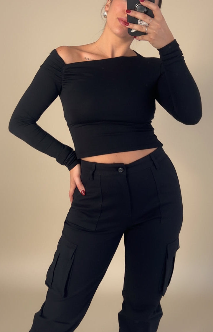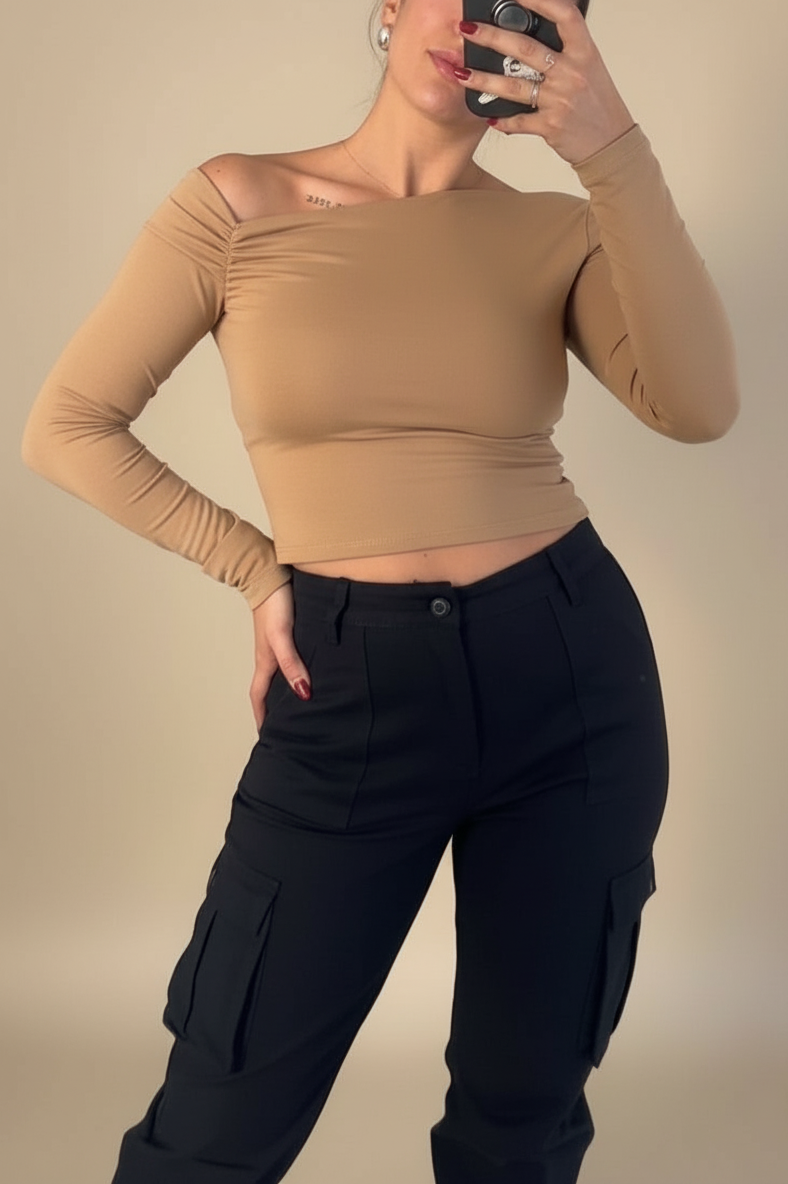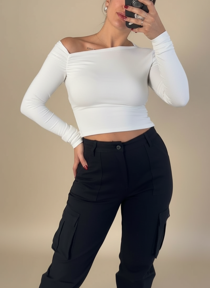 Confeccionado en un tejido suave y adaptable, se ajusta cómodamente al cuerpo creando una silueta estilizada sin perder movilidad. Su corte cropped permite combinarlo con pantalones de tiro alto, faldas o cargos para un resultado versátil: desde un outfit casual-chic hasta un look de noche impecable.