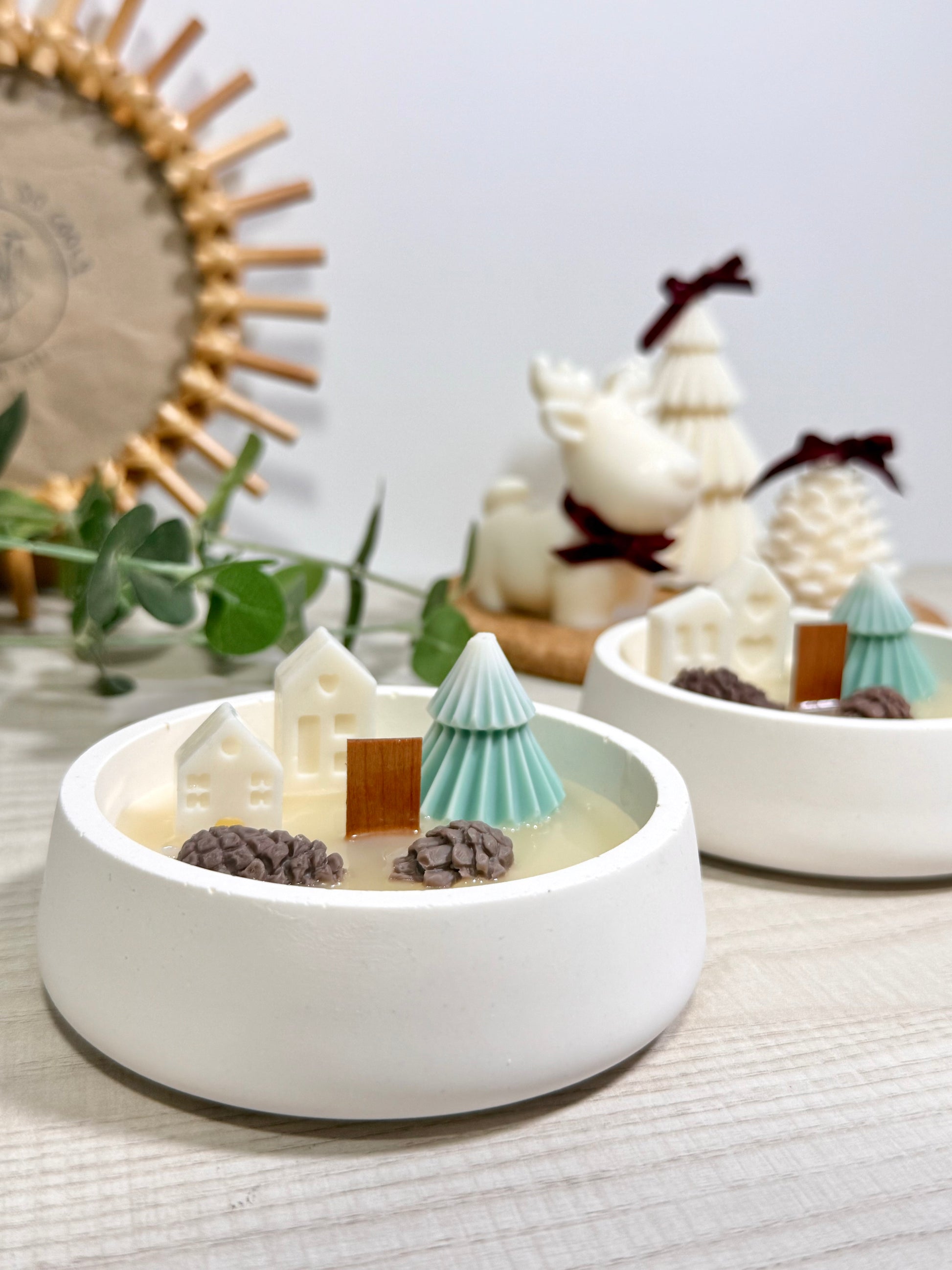 Recipiente hecho de resina natural a mano. Vela en cera de soja con pabilo de madera. Con su diseño de pueblo navideño es perfecto para crear un ambiente festivo.