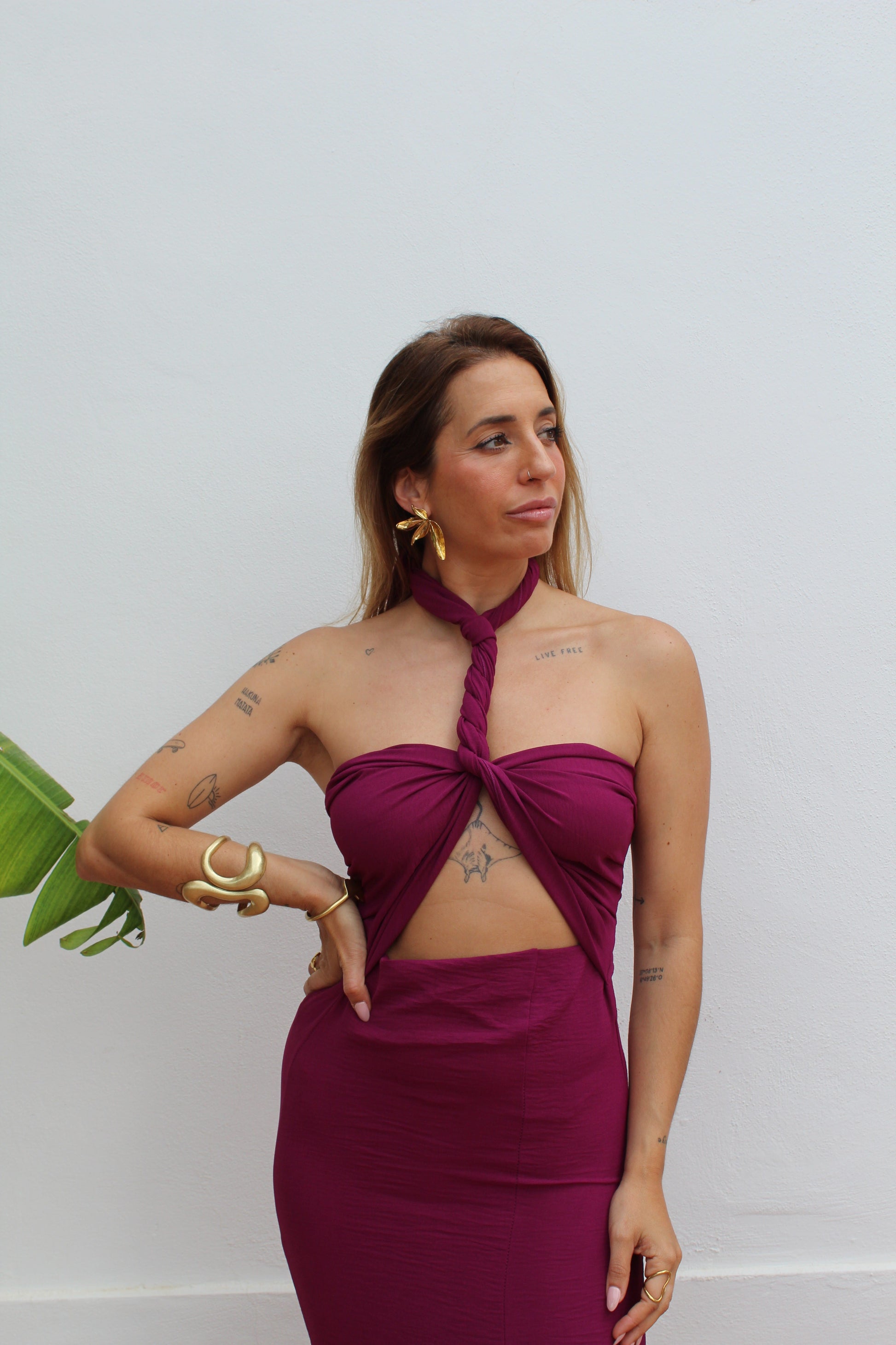 Nuestro vestido Anais es versátil, con múltiples opciones de escote y anudado en el cuello.