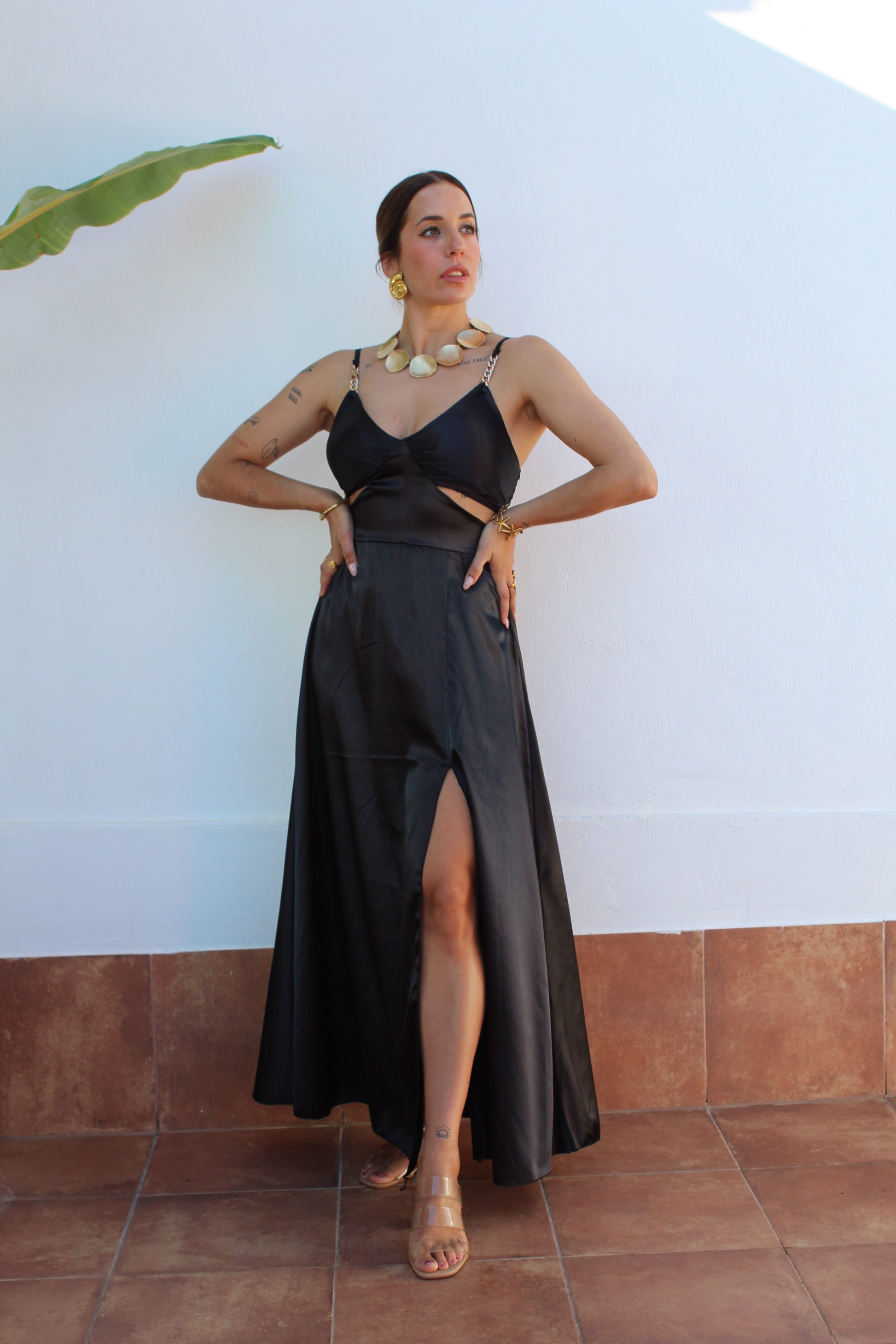 Su diseño sensual y romántico, con escote en V, cut out laterales y una elegante cadena dorada en los tirantes, te harán sentir como una diosa.